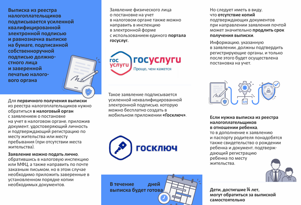 Наряду с выпиской из ЕГРН постановку на учет или снятие с учета в налоговом органе будут подтверждать выписка из ЕГРЮЛ (Единого государственного реестра юридических лиц), выписка из государственного реестра аккредитованных филиалов, представительств иностранных юрлиц и выписка из ЕГРИП (Единого государственного реестра индивидуальных предпринимателей).