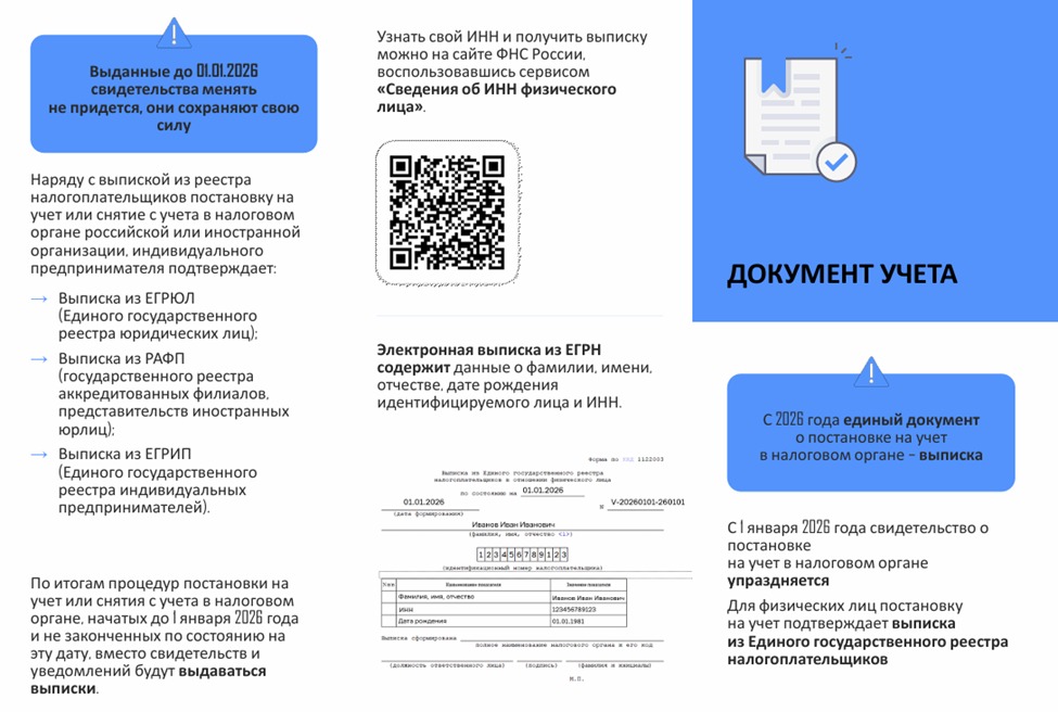 С 1 января 2026 года свидетельство о постановке на учет в налоговом органе упраздняется. Для физических лиц подтверждать постановку на учет будет выписка из ЕГРН (Единого государственного реестра налогоплательщиков). Но выданные ранее свидетельства менять не придется, они сохраняют свою силу.