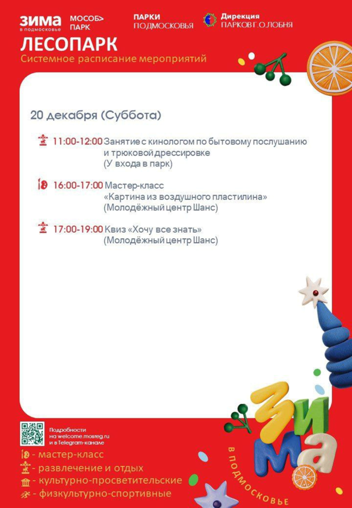 20 декабря в Лобненском лесопарке гостей ждут мастер-класс «Картина из воздушного пластилина», квиз «хочу все знать», а также занятие с кинологом по бытовому послушанию и трюковой дрессировке.