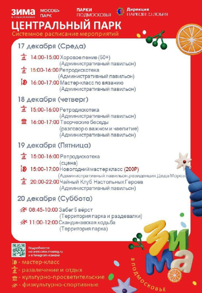 Так, с 17 по 20 декабря в Центральном парке культуры и отдыха жителей и гостей города ждут мастер-класс по вязанию, хоровое пение, ретродискотеки, настольные игры и творческая беседа. Любителей спорта приглашают на скандинавскую ходьбу и традиционный забег 5 вёрст.
