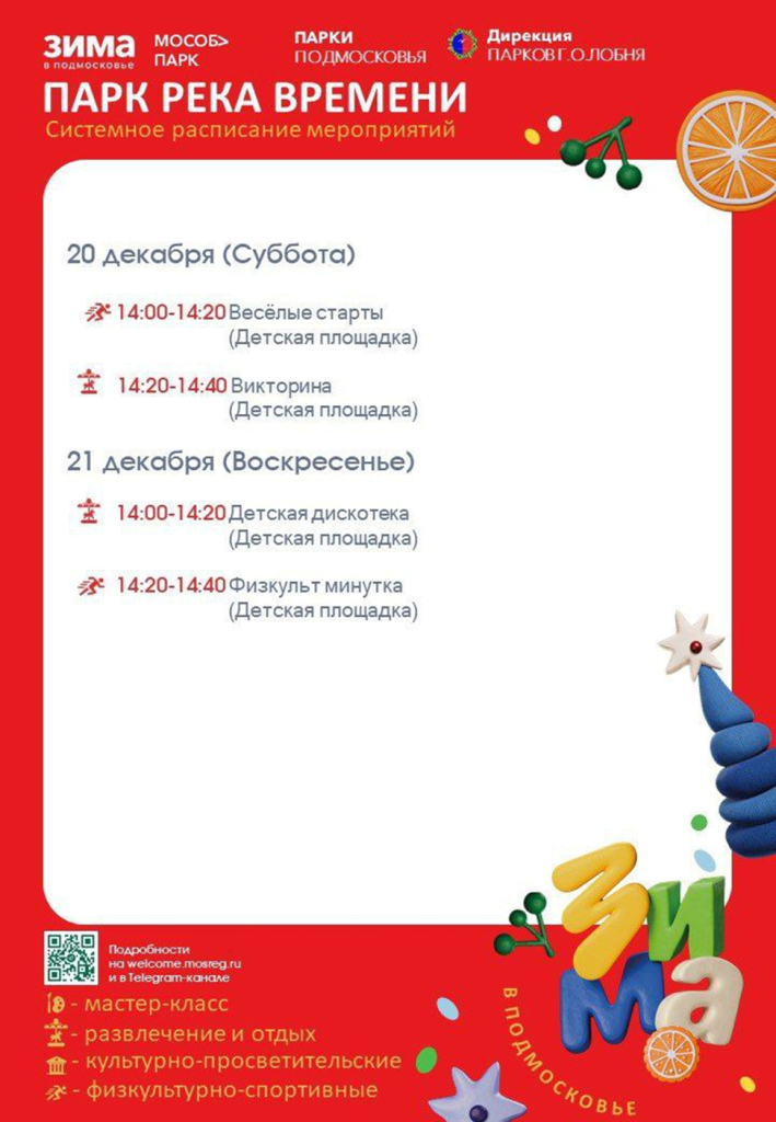 20 и 21 декабря для посетителей парка «Река времени» состоятся веселые старты, детская дискотека, физкульт-минутка и викторина.