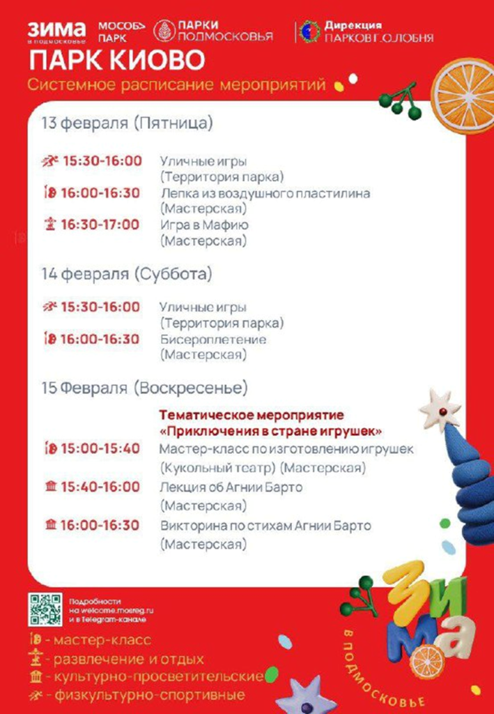 13 февраля в парке «Киово» пройдут мастер-класс по лепке из воздушного пластилина и игра в Мафию. 14 и 15 февраля там состоятся уличные игры, мастер-классы по бисероплетению и изготовлению игрушек, лекция об Агнии Барто и викторина по ее стихам.