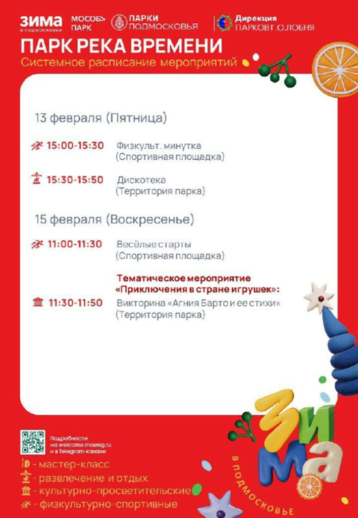 В парке «Река времени» 13 и 15 февраля состоятся веселые старты, физкульт-минутка, дискотека и викторина «Агния Барто и ее стихи».
