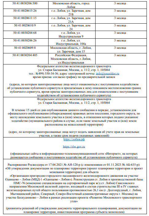 Реконструкция ст. Лобня и производственной базы ПМС-76 (изменение специализации на сортировочный парк ж/д ст. Лобня) Савеловского направления Московской железной дороги», входящей в состав строительства III и IV главных железнодорожных путей общего пользования протяженностью 26,1 км (г. Долгопрудный, г. Лобня, Мытищинский район, Северный, Северо-Восточный административные округа г. Москвы) на участке Бескудниково – Лобня в рамках реализации проекта «Развитие Московского транспортного узла», предусмотренных подпунктом 2 части 5 статьи 4 Федерального закона от 31.07.2020 № 254-ФЗ «Об особенностях регулирования отдельных отношений в целях модернизации и расширения магистральной инфраструктуры и о внесении изменений в отдельные законодательные акты Российской Федерации», возможно установление публичных сервитутов в интересах ОАО «РЖД» (ОГРН 1037739877295, ИНН 7708503727; 107174, Москва, ул. Новая Басманная, д. 2/1, стр. 1; dkss@dkss.ru; 8 (499) 262-42-57) сроком 31 месяц в отношении следующих земельных участков и земель в границах кадастровых кварталов: