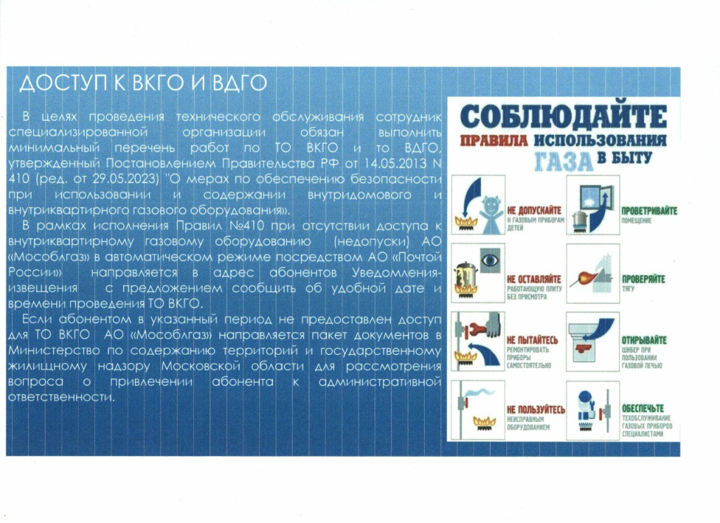 5. Не отключайте автоматику безопасности и регулирования. Запрещается пользоваться газом при неисправных газовых приборах, автоматике, арматуре и газовых баллонах, особенно при обнаружении запаха газа. При появлении запаха газа в помещении или на улице незамедлительно сообщите об этом по телефону 104 или 112. До приезда аварийной бригады необходимо проветрить помещение, не зажигать огонь, не включать и не выключать электрическое освещение, не пользоваться электрическими приборами и электрозвонками. Помните, каждому собственнику газового оборудования необходимо иметь договор на техническое обслуживание со специализированной организацией. Чтобы заключить договор с Мособлгазом, подайте заявку через Личный кабинет клиента или обратитесь на бесплатную горячую линию 8 800 200-24-09.