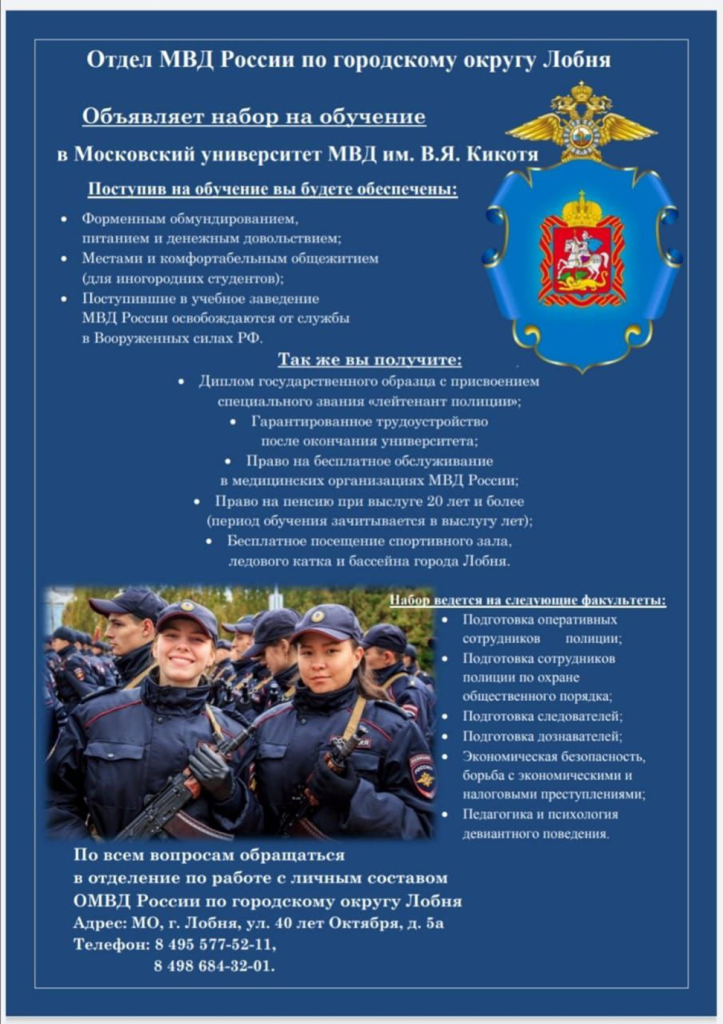 Отдел МВД России по городскому округу Лобня объявляет набор на обучение в Московский университет МВД имени В.Я. Кикотя.