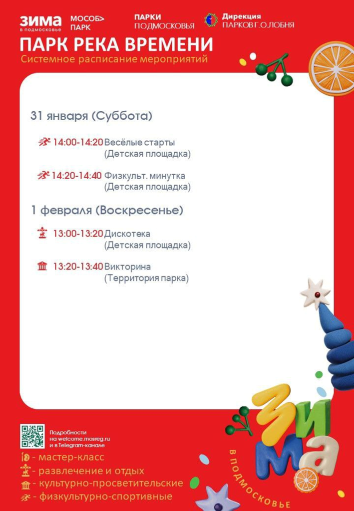 В парке «Река времени» 31 января и 1 февраля пройдут веселые старты, физкульт-минутка, дискотека и викторина.