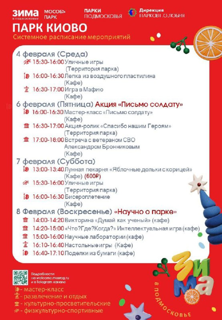 В парке «Киово» пройдут уличные и настольные игры, встреча с ветераном СВО Александром Бронниковым, викторина, научные лаборатории и мастер-классы по поделкам из бумаги и лепке из воздушного пластилина.