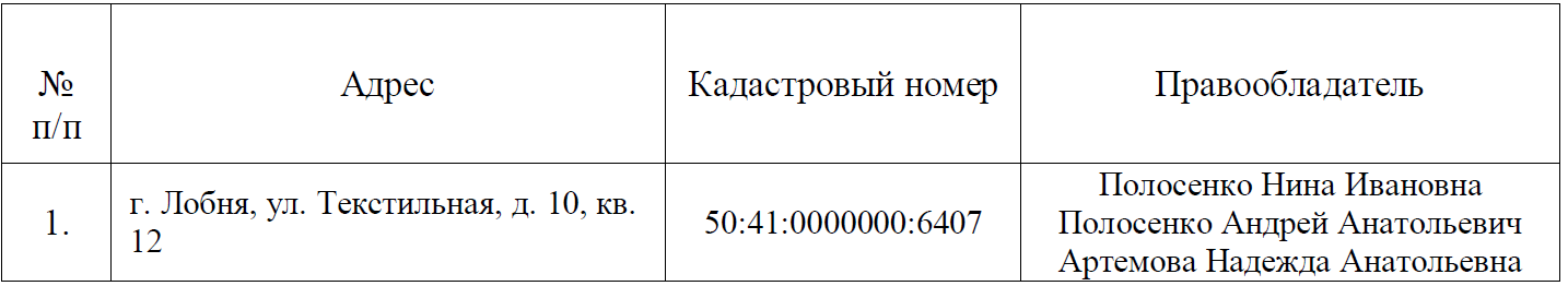 Администрация муниципального образования «городской округ Лобня» Московской области, информирует, что в результате проведенных мероприятий по выявлению правообладателей ранее учтённых объектов недвижимости в соответствии со статьёй 69.1 Федерального закона от 13.07.2015 № 218-ФЗ «О государственной регистрации недвижимости» выявлены правообладатели следующих объектов недвижимости: