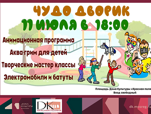На площади у дома культуры «Красная Поляна» городского округа Лобня открыта летняя развлекательная площадка «Чудо-Дворик». Ближайшие мероприятия на ней пройдут 11 июля и станут отличной возможностью для семейного отдыха под открытым небом.