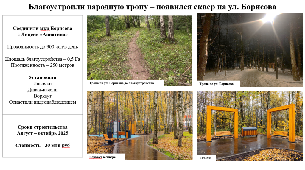 Построено и отремонтировано троп и тротуаров 27 за бюджет 12 за частные инвестиции |